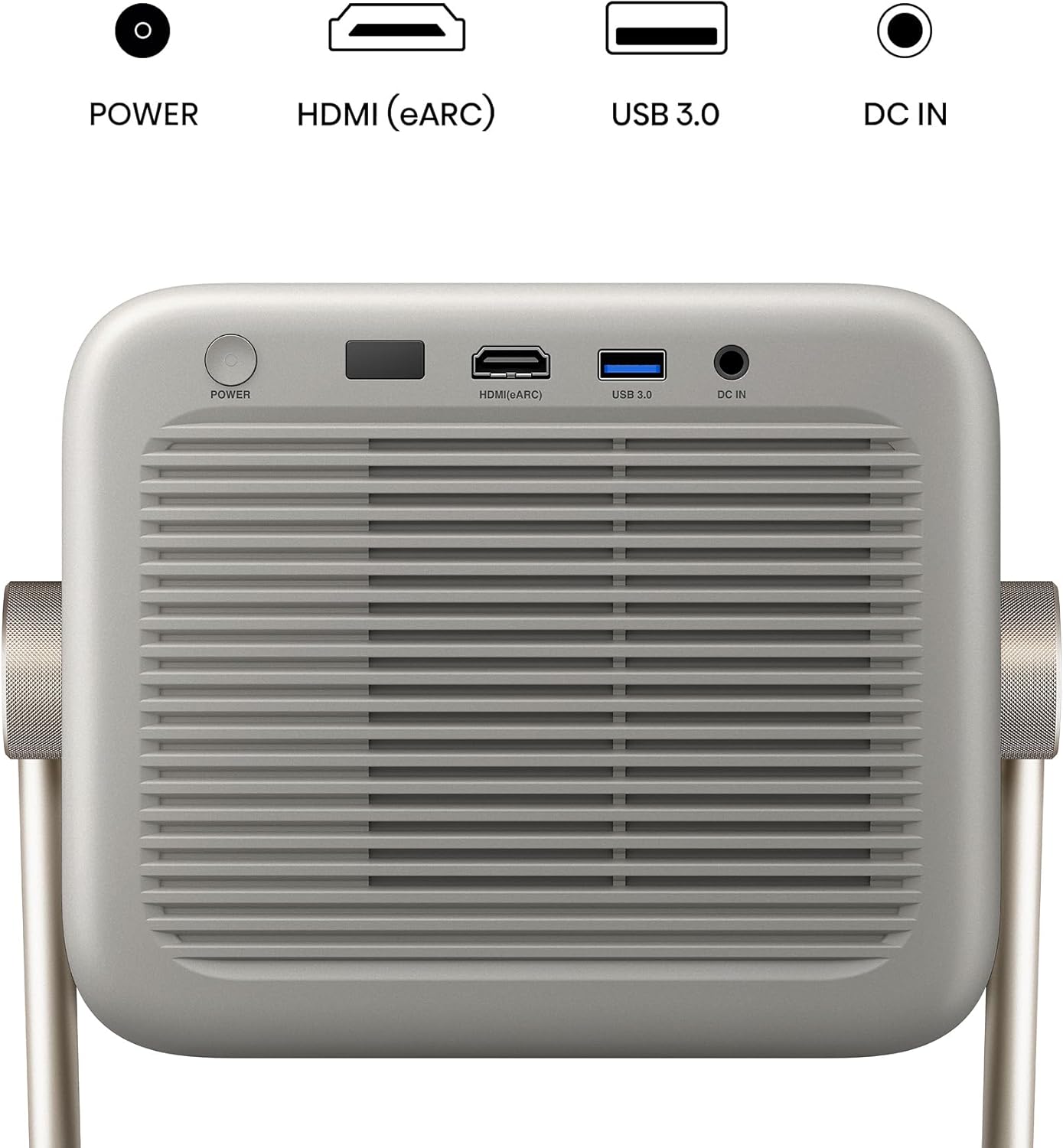 Con un diseño compacto en color gris metálico, el proyector mide 19,3 cm de ancho, 21,8 cm de profundidad y 23 cm de altura, y tiene un peso de 3,6 kg, lo que facilita su transporte y ubicación en distintos espacios del hogar o la oficina.