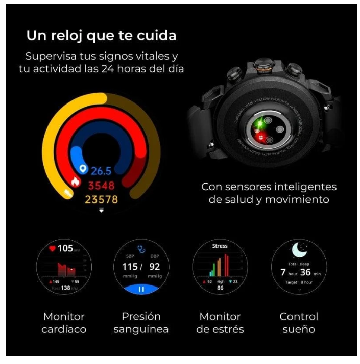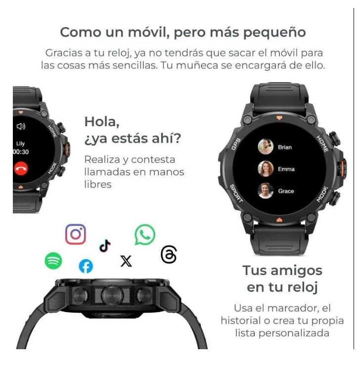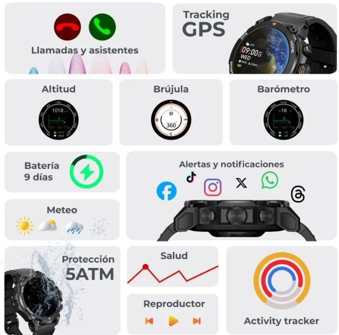 Gestión de llamadas, notificaciones de apps y control total desde la muñeca gracias a su micrófono y altavoz internos. El diseño con caja de aleación de zinc y correas universales de silicona (22 mm, intercambiables) garantiza comodidad y robustez incluso con uso intensivo. Si valoras resistencia, datos de salud avanzados y conectividad real, este smartwatch es para ti. Aprovecha y lleva tu aventura al límite con la seguridad y versatilidad que exige un usuario experto.