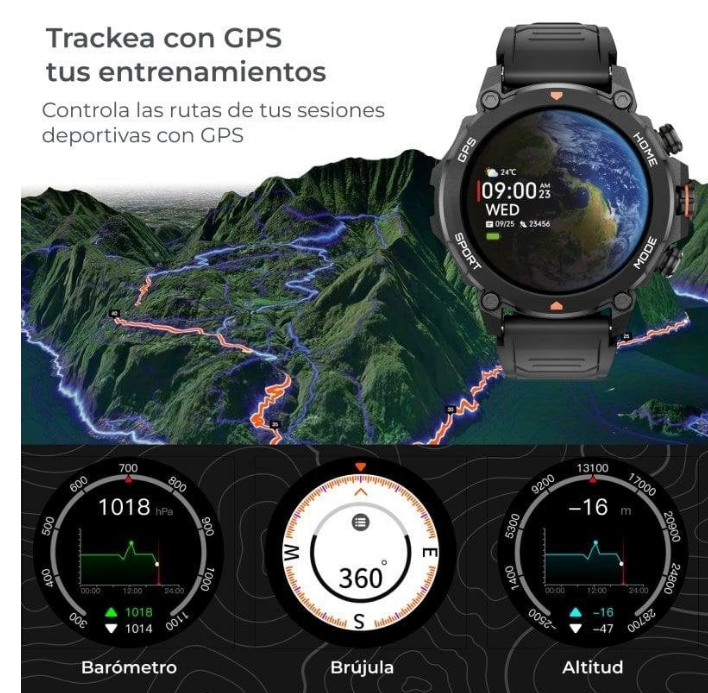 Equipa GPS integrado para registro y navegación en rutas de senderismo, ciclismo o deportes de montaña, almacenando los trayectos en la app Smart-Time Pro para visualización y análisis posterior. Los más de 100 modos deportivos cubren desde trail hasta deportes acuáticos como surf o paddle surf, apoyados con resistencia al agua 5ATM. Además, incorpora brújula, altímetro y barómetro, perfectos para quienes exploran zonas remotas.